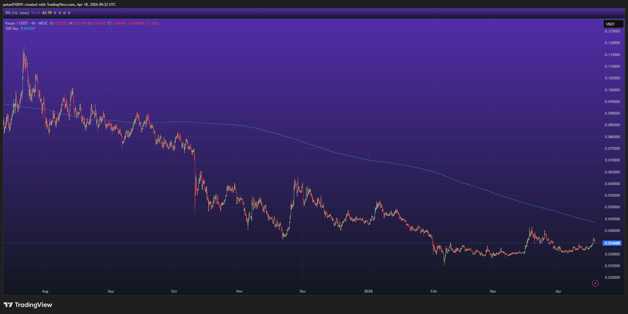 The 4‑hour KAS/USDT chart on MEXC shows a token under pressure. The KAS price trades at $0.034688, down 1.5% today. The 200‑day moving average sits at $0.043567 – a full 25% above current price. KAS has been below the 200‑day MA for weeks, a classic bearish signal.