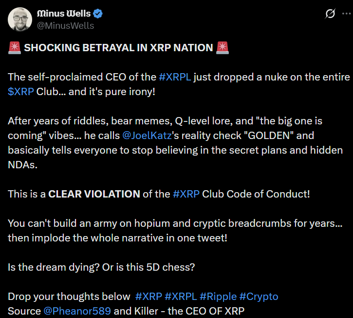 The split is telling. A portion of the XRP Army wants to believe in hidden master plans. Another portion is relieved that a senior executive finally killed the hopium cycle. And a third group treats the whole thing as a comedy, enjoying the drama without taking a side.
